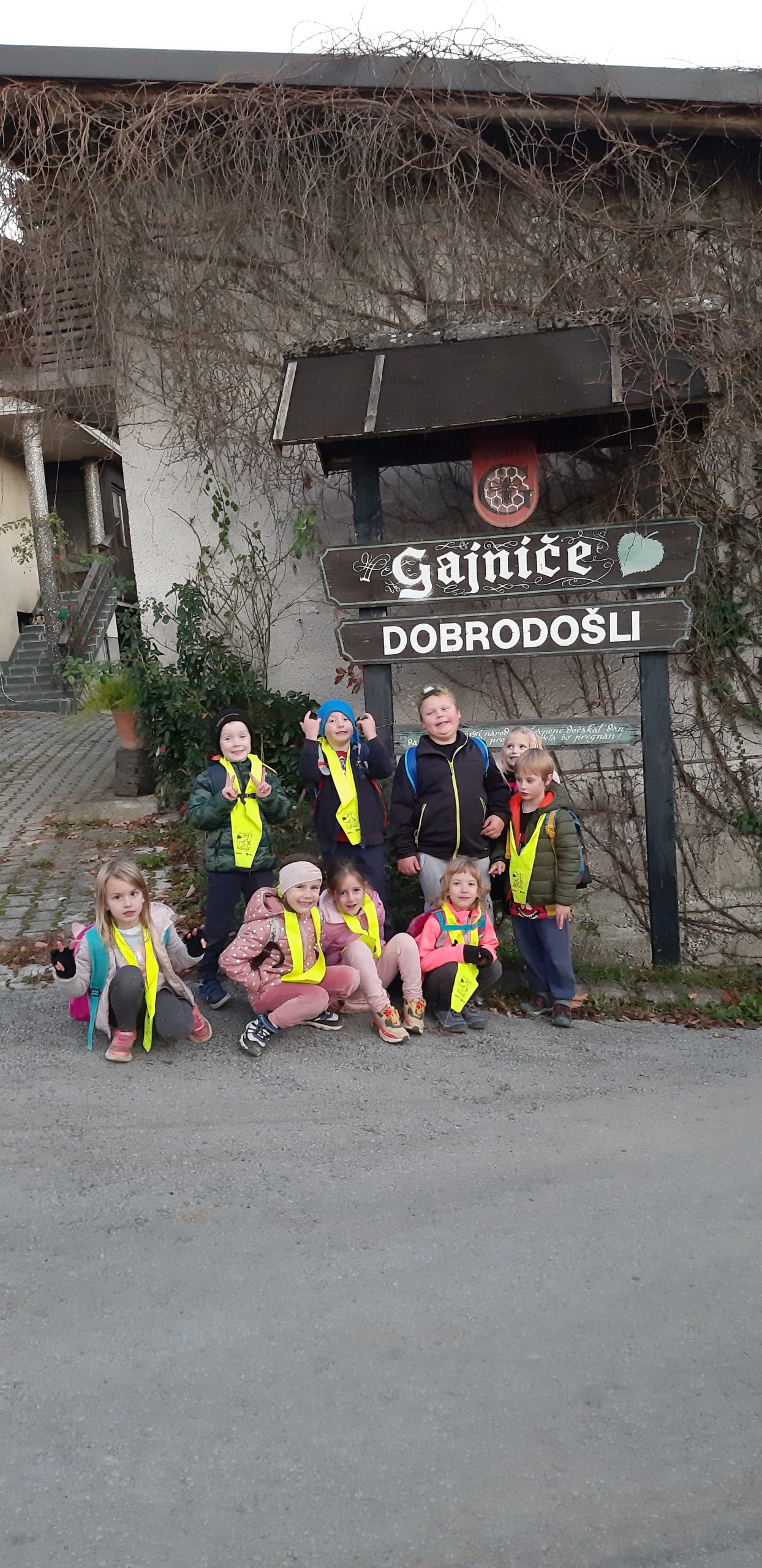 Nadaljevanje naše poti je bilo lažje. Spustili smo se navzdol v dolino v Gajniče, ob tem pa občudovali barvitost jesensko obarvanega listja dreves, ki je bilo delno že na tleh. Kmalu smo naleteli na lepo belo kozo, ki je levo ob hiši žvečila travo, zatem pa še več krav, ki so se pasle na velikem travniku. Z navdušenjem smo stekli do njih, saj so delovale zelo prijazno. Poleg pašnika je dom ene naših pohodnic in njeni starši so nam pripravili jabolka, da smo lahko z njimi hranili krave. Kmalu pa niso bile lačne le krave, ki so veselo prežvekovale, lačni smo postali tudi mi. Privoščili smo si malico. Odžejali smo se z zelo okusnim domačim jabolčnim sokom, s katerim sta nas pogostila starša pohodnice.