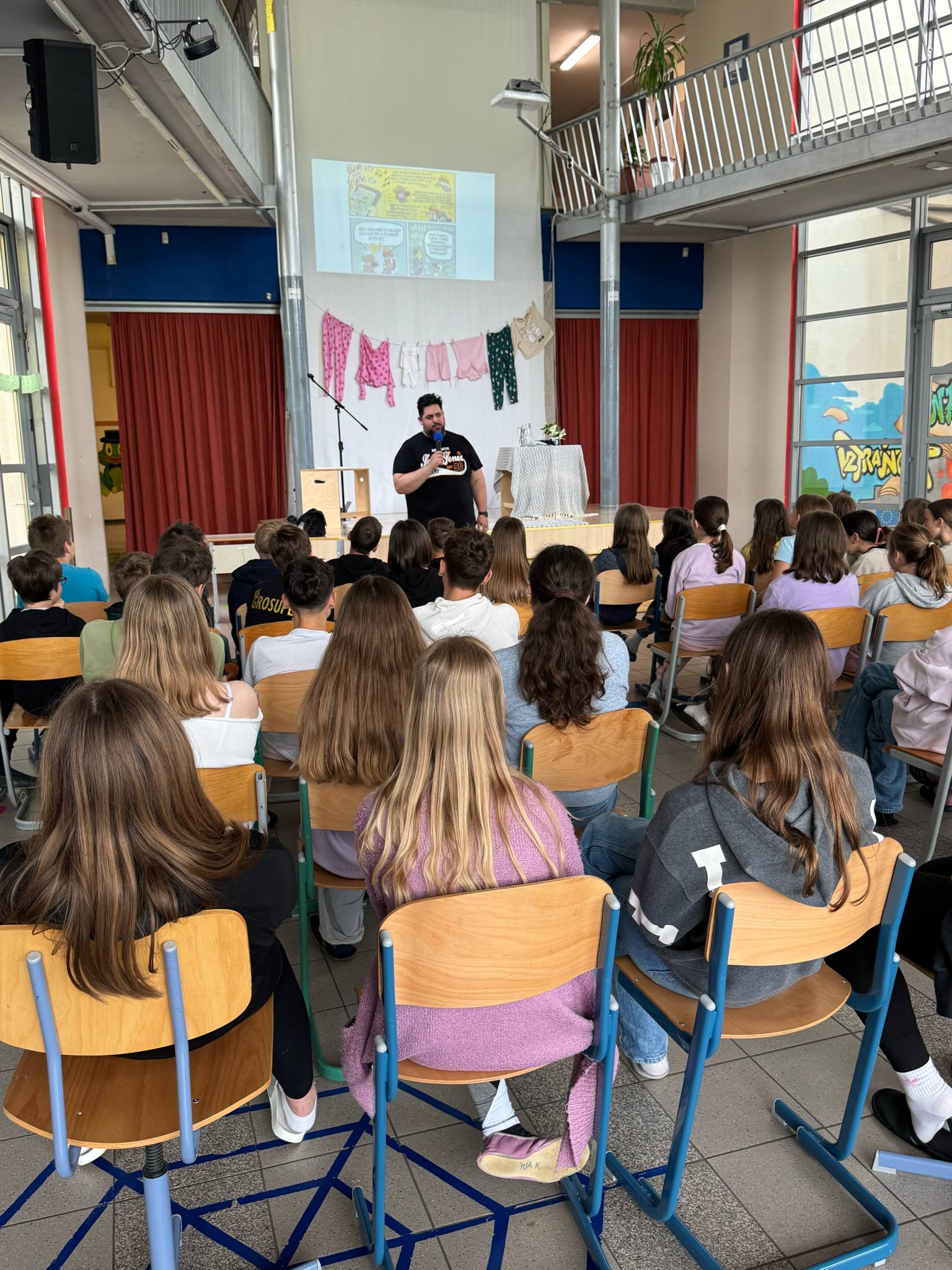 Še posebej nepozaben je bil nastop za mlajše učence, ki so ga pričakali kar v pižamah! S tem so poskrbeli za pravo vzdušje in že s svojo podobo nasmejali Pižamo, ki jim je vrnil z obilico smeha, zabavnih prigod in prisrčnega stika z občinstvom. V avli šole je dobesedno pokalo od smeha!